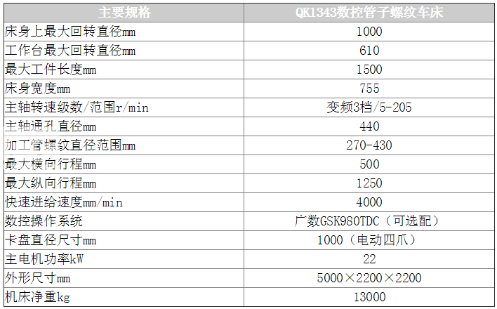 QK1343型數(shù)控管螺紋車床是針對石油、化工、冶金行業(yè)輸油管、鉆桿、套管的螺紋加工要求專業(yè)化設(shè)計制造。機床采用雙卡盤夾緊方式,數(shù)控系統(tǒng)自動控制,可******加工各種內(nèi)、外螺紋,并具有普通數(shù)控車床的功能