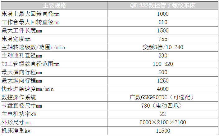 QK1332型數(shù)控管螺紋車床是針對石油、化工、冶金行業(yè)輸油管、鉆桿、套管的螺紋加工要求專業(yè)化設(shè)計制造。機(jī)床采用雙卡盤夾緊方式,數(shù)控系統(tǒng)自動控制,可******加工各種內(nèi)、外螺紋,并具有普通數(shù)控車床的功能。